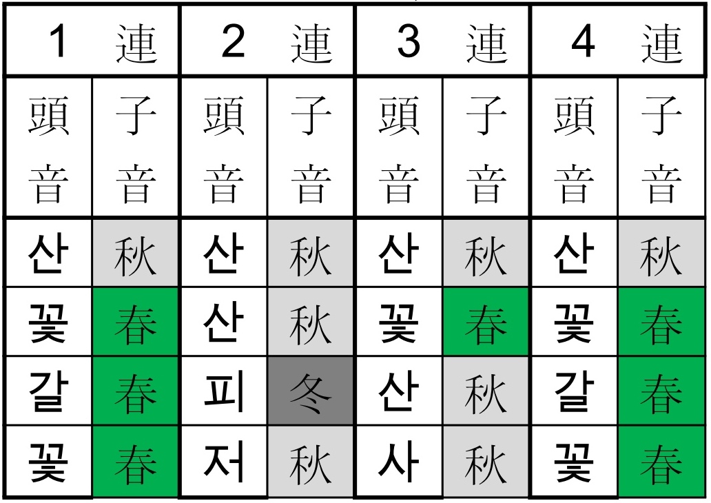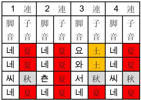 では、ここで、各連の頭音と脚音を五行の季節で表してみましょう。