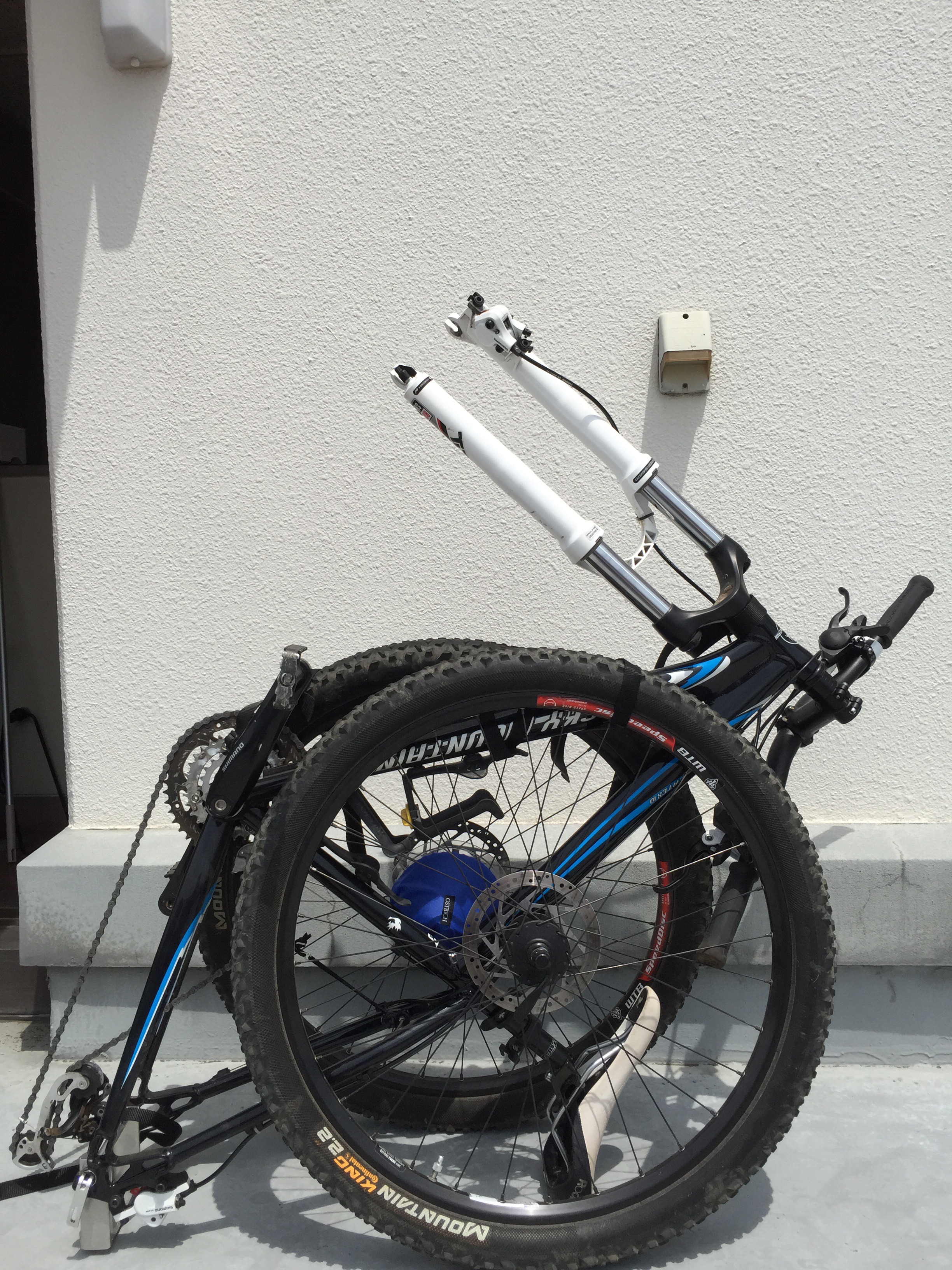 写真は翌日輪行袋から出して組み立てる前の愛車。MTBを輪行袋に出し入れするのはロードレーサーより簡単だ。この愛車で何台目になるだろうか。浮気者と呼ぶなかれ。