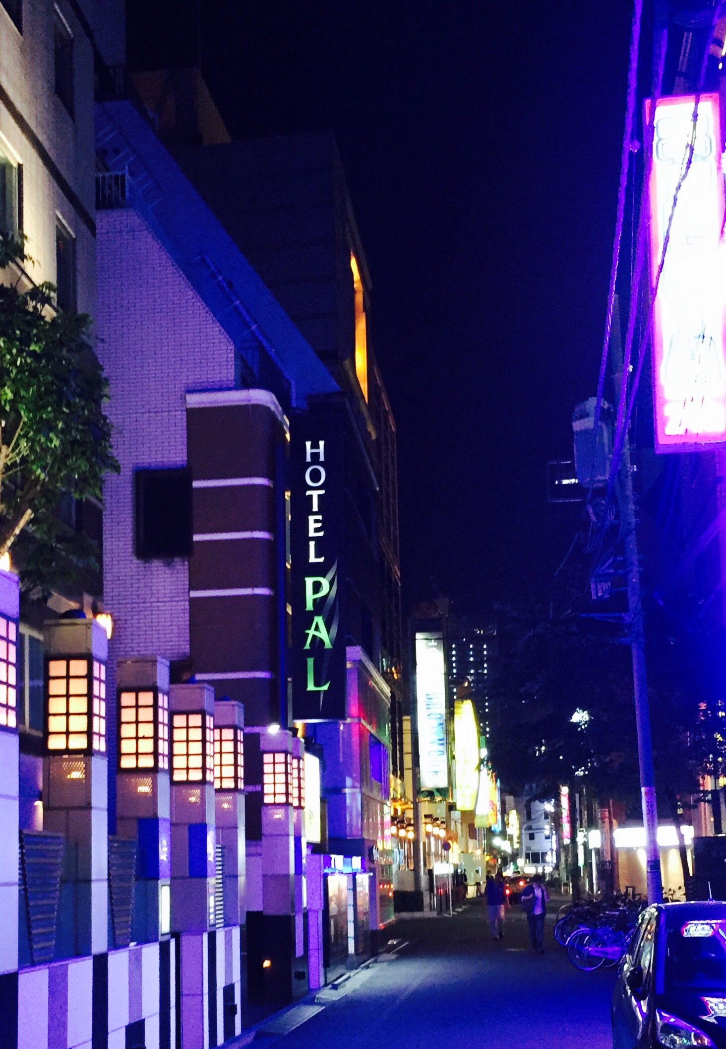 ↑ホテル北側、林立するラブホの向こうに Hotel Gracery があるはずだが、不夜城の照明が明かるすぎて見えない ↑ホテル南側、道路を埋め尽くした人びとの上空を、暴力バーに注意を呼びかける拡声器の音声が虚しく響きわたる