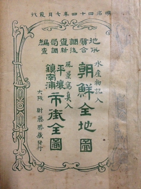 この地図は90年代末に神保町の古書店で購入したものです。地図を折りたたんで入れる封筒(上の写真、右側部分が補修されている)に「地質調査局編、併合後新調査」と書いてあります。百年経った今も保存状態がきわめてよいのが不思議なぐらいです。