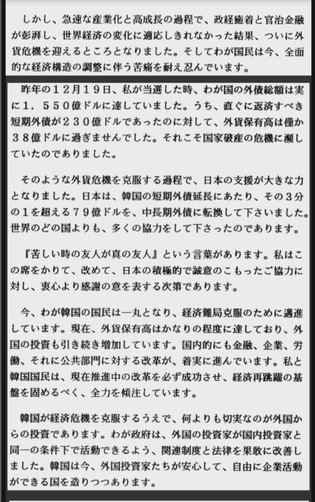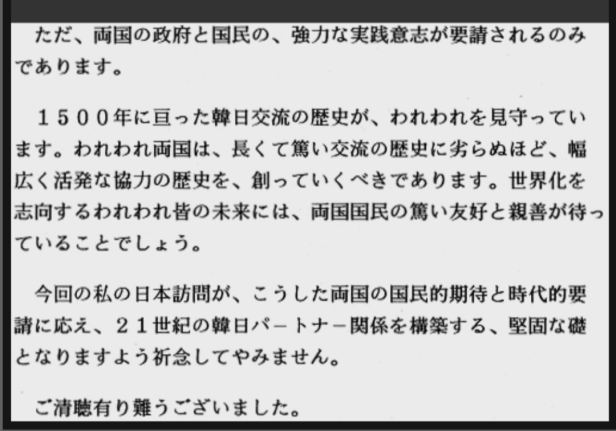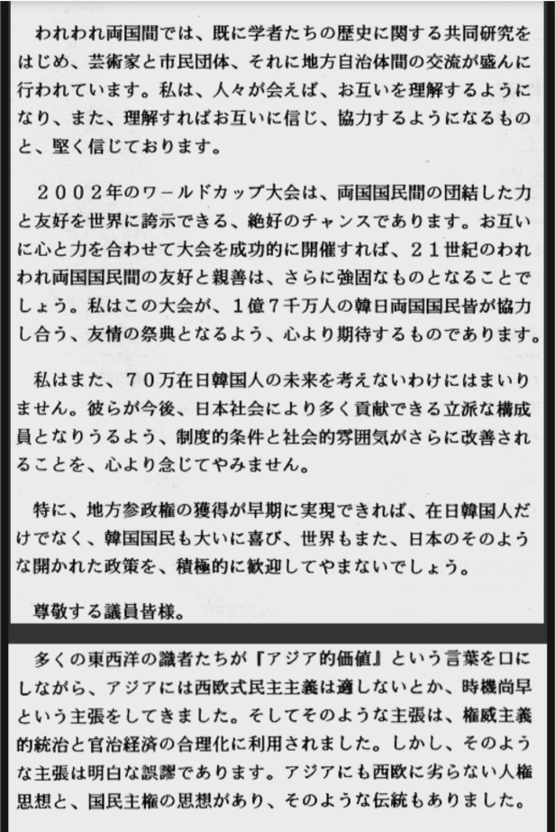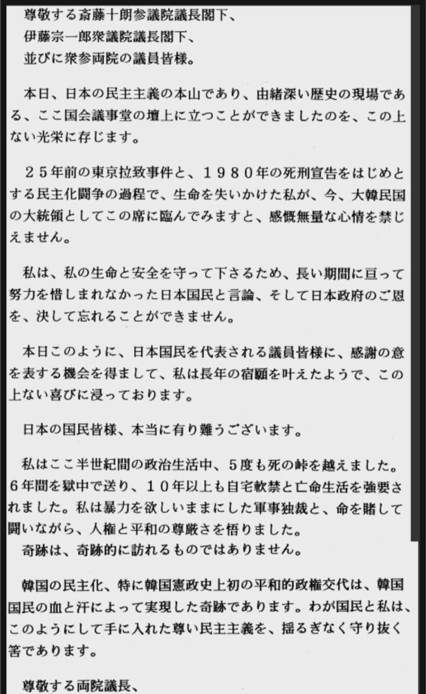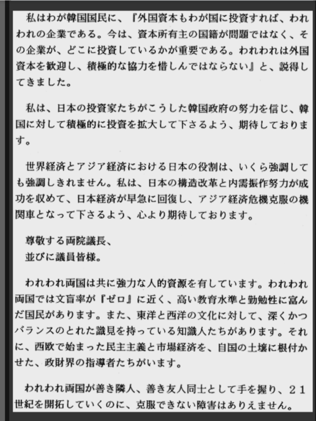 1998年10月の日本の国会における金大中大統領の演説は経験と歴史的信念に裏打ちされた格調高いスピーチです。日本と韓国の中高校の教科書に二つの言語で載せてもらいたいと思いました。日韓の中高生が英米の首相や大統領の演説を学ぶように、日本の中高生が韓国大統領の演説を韓国語で聴いて理解する。あるいは、韓国の中高生が日本語で理解する。そんなことが実現できればいい、ぜひ実現するべきである、と考えます。