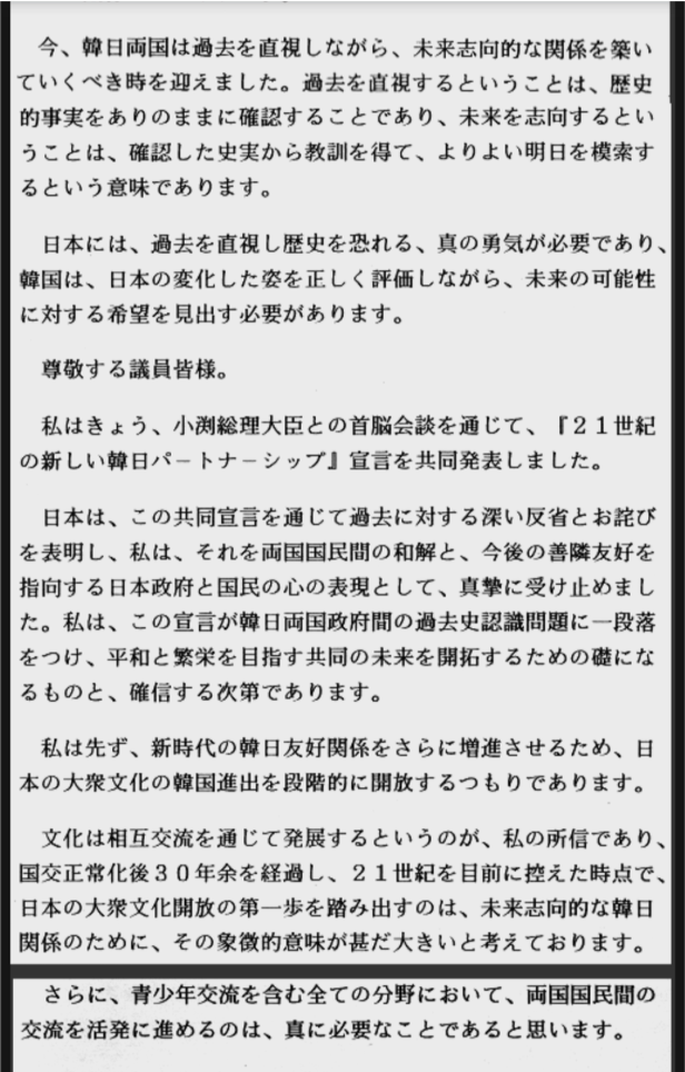これらに関して、金大中・元大統領は、日本の大衆文化開放の歴史的意味に触れ、「1500年以上の日韓交流の歴史の中で豊臣秀吉による軍事侵攻(文禄・慶長の役)と戦前の植民地時代を含めても不幸の歴史は40年程度。そのことをもってして、両国の長い友好の歴史を全否定してよいのか」との趣旨の国会演説をしています(1998年10月8日金大中大統領日本国会演説文)。寛容の精神に富む誇り高い内容だと今もって感じます。(以下、同演説文の原稿を参照ください)