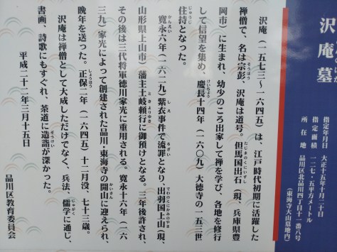 同じく東海寺の墓地内に澤庵宗彭(1573-1645)の墓がある。漬物石そのものを置いたような墓だ。澤庵が没して約50年後に賀茂眞淵が生まれている。賀茂眞淵の没後250年の現在からはどちらも同じ時代にいたように見える。