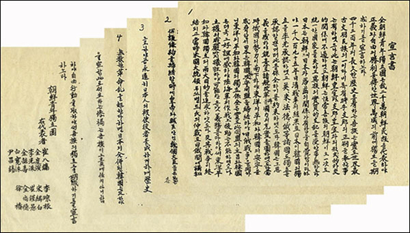 吾等은 玆에 我 朝鮮의 獨立國임과 朝鮮人의 自主民임을 宣言하노라 此로써 世界萬邦에 告하야 人類平等의 大義를 克明하며 此로써 子孫萬代에 誥하야 民族自存의 正權을 永有케 하노라. 半萬年 歷史의 權威를 仗하야 此를 宣言함이며 二千萬 民衆의 誠忠을 合하야 此를 佈明함이며 民族의 恒久如一한 自由發展을 爲하야 此를 主張함이며 人類的良心의 發露에 基因한 世界改造의 大機運에 順應幷進하기 爲하야 此를 提起함이니 是이며 天의 明命이며 時代의 大勢이며 全人類 共存同生權의 正當한 發動이라 天下何物이던지 此를 沮止抑制치 못 할지니라. 舊時代의 遺物인 侵略主義 强權主義의 犧牲을 作하야 有史以來 累千年에 처음으로 異民族 箝制의 痛苦를 甞한 지 今에 十年을 過한지라 我 生存權의 剝喪됨이 무릇 幾何이며 心靈上 發展의 障礙됨이 무릇 幾何이며 民族的 尊榮의 毁損됨이 무릇 幾何이며 新銳와 獨創으로써 世界文化의 大潮流에 寄與補裨할 機緣을 遺失함이 무릇 幾何이뇨.