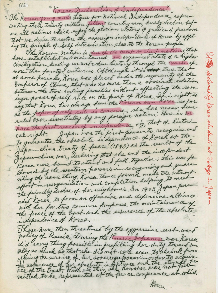 保護條約을 締結할 時에 皇帝와 賊臣 안인 幾個大臣들은 모든 反抗手段을 다하얏고 發表 後에도 全國民은 赤手로 可能한 온갖 反抗을 다하얏으며 司法, 警察權의 被奪과 軍隊解散時에도 然하얏고 合倂時를 當하야는 手中에 寸鐵이 無함을 不拘하고 可能한 온갓 反抗運動을 다하다가 精銳한 日本武器에 犧牲이 된 者ㅣ 不知其數며 以來 十年間 獨立을 恢復하랴는 運動으로 犧牲된 者ㅣ 數十萬이며 慘酷한 憲兵政治下에 手足과 口舌의 搭制를 受하면서도 曾히 獨立運動이 絶한 적이 업나니 此로 觀하여도 日韓合倂이 朝鮮民族의 意思가 아님을 可知할지라. 如此히 吾族은 日本軍國主義的 野心의 詐欺暴力下에 吾族의 意思에 反하는 運命을 當하얏으니 正義로 世界를 改造하는 比時에 當然히 匡正을 世界에 求할 權利가 有하며 또 世界改造에 主人되는 米와 英은 保護와 合倂을 率先承認한 理由로 此時에 過去의 舊惡을 贖할 義務가 有하다 하노라.