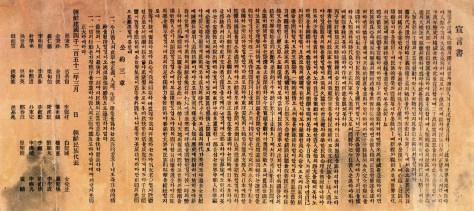 | 一、 今日 吾人의 此擧는 正義、 人道、 生存、 尊榮을 爲하는 民族的 要求이니 오즉 自由的 精神을 發揮할 것이오 決코 排他的 感情으로 逸走하지 말라. 一、 最後의 一人ᄭᅡ지 民族의 正當한 意思를 快히 發表하라. 一、 一切의 行動은 가장 秩序를 尊重하야 吾人의 主張과 態度로 하야금 어대ᄭᅡ지던지 光明正大하게 하라. |