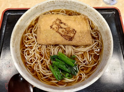 きつねそばにあぶらげとほうれん草が乗っていて、甘党の僕にはたまらなくおいしい。あふらげに烙印があり、よく観察すると店の屋号だった。この烙印に特別感を感じる僕はよほどのそば好きなのだろう。