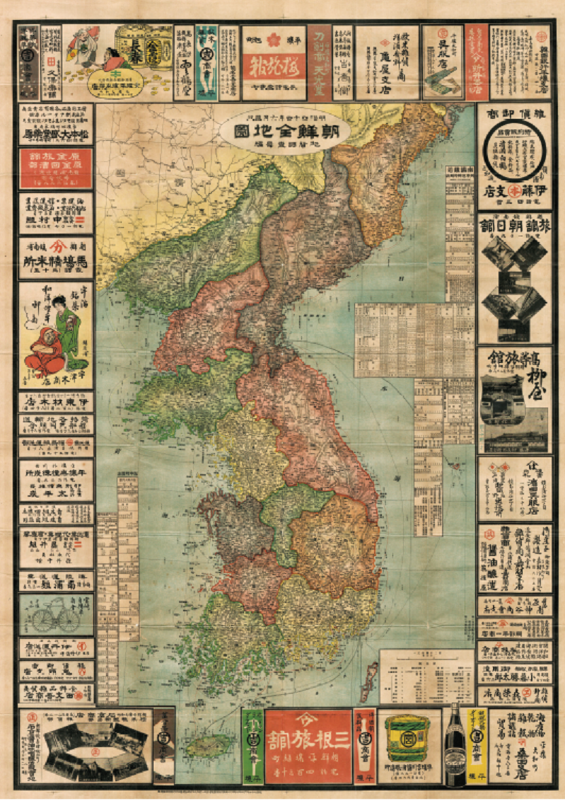 위의 지도와 대일본제국(1868-1947)이 대한제국(1897-1910)을 병합한 다음 해인 1911년에 발행된 아래의 조선 전도도(朝鮮全地圖)를 나란히 비교해 보자. 전자는 도야마현을 중심으로 공간적으로 역전된 것이며, 후자는 역사(시간)를 역행시킨 것이다.