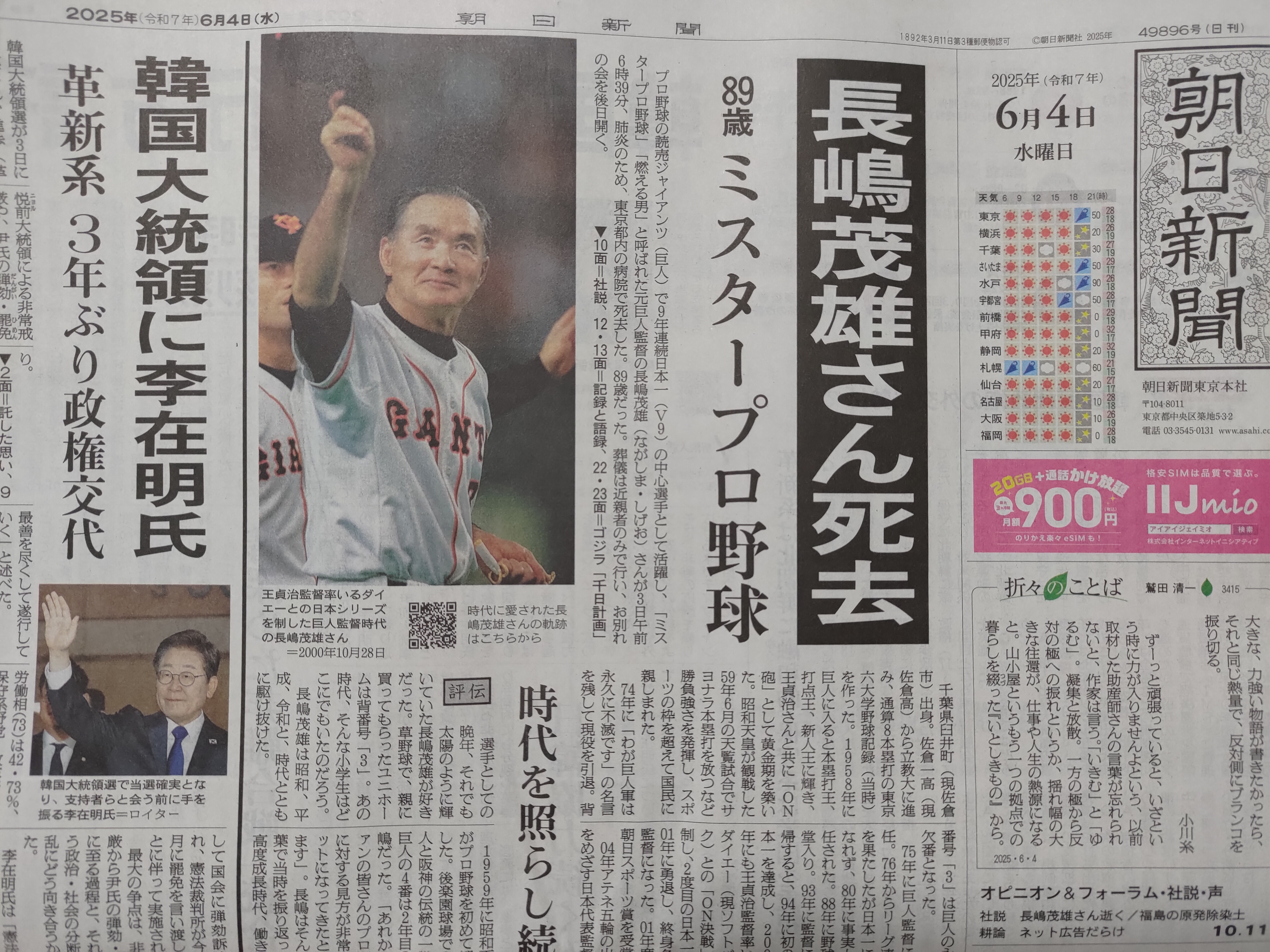 아사히 신문아 너도 그렇군요? 요미우리신문이 호외를 내거나 1면 톱에 나가시마 선수의 부고를 실은 것은 당연하다고 할 수 있다. 다만, 아사히신문은 한국의 대통령 선거를 톱으로 다뤄주었으면 좋았을 텐데. 천성인어(天聲人語)까지 나가시마 예찬이 되니, 아, 너도 그렀구나 하고 한탄하고 싶을 정도다. 최근 NHK 프로그램의 민방화(民放化)와 마찬가지로 미디어의 동질화(同質化) 경향에 섬뜩함을 느끼는 자는 나만일까.