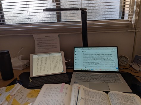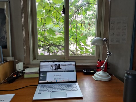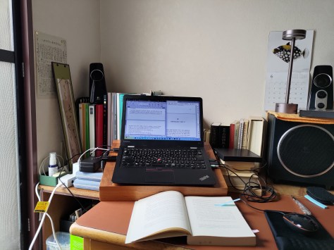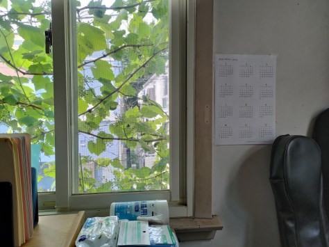 友人宅の2階東北角にある葡萄の蔓で囲まれた窓のある部屋、ここが新しいオフィスだ。水曜と木曜に出勤する。窓を開けると近くの小学校に通う児童たちの元気な声が聞こえる。
