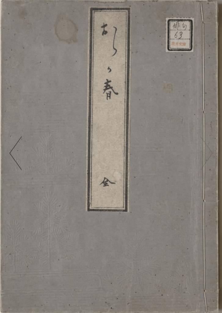 一茶(1763-1828)は生前に句集の出版を準備していたが、果たせなかった。没後25年経った嘉永5(1852)年、「おらが春」を自費出版したのは自筆稿本を持っていた白井一之(1821-84)で、題名は句集「善甲寺上人の話」の「目出度さもちう位也おらが春」からとったという。一茶が亡くなったとき彼は7歳だった。